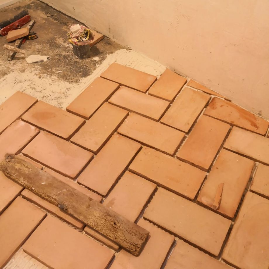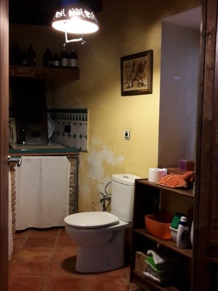 Una vez resuelto el problema, los acabamos consisten en el revestimiento con un mortero a la cal estucado de la marca Weber en las paredes del baño, a excepción de la nueva zona de ducha que cuenta con azulejos porcelánicos. El suelo se ejecuta en ladrillos rústicos de barro.